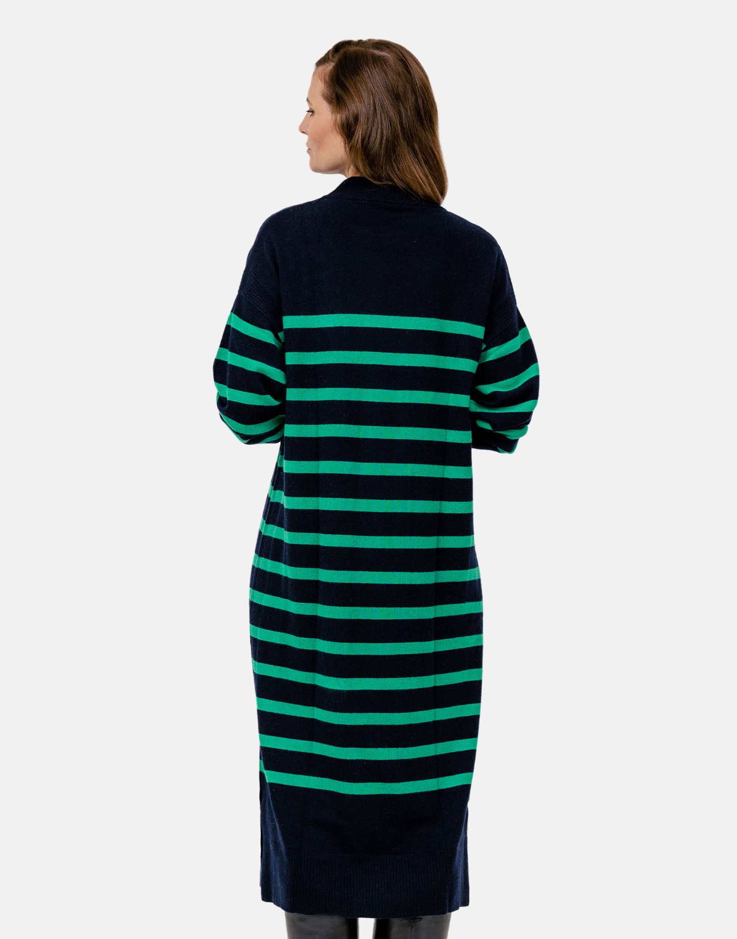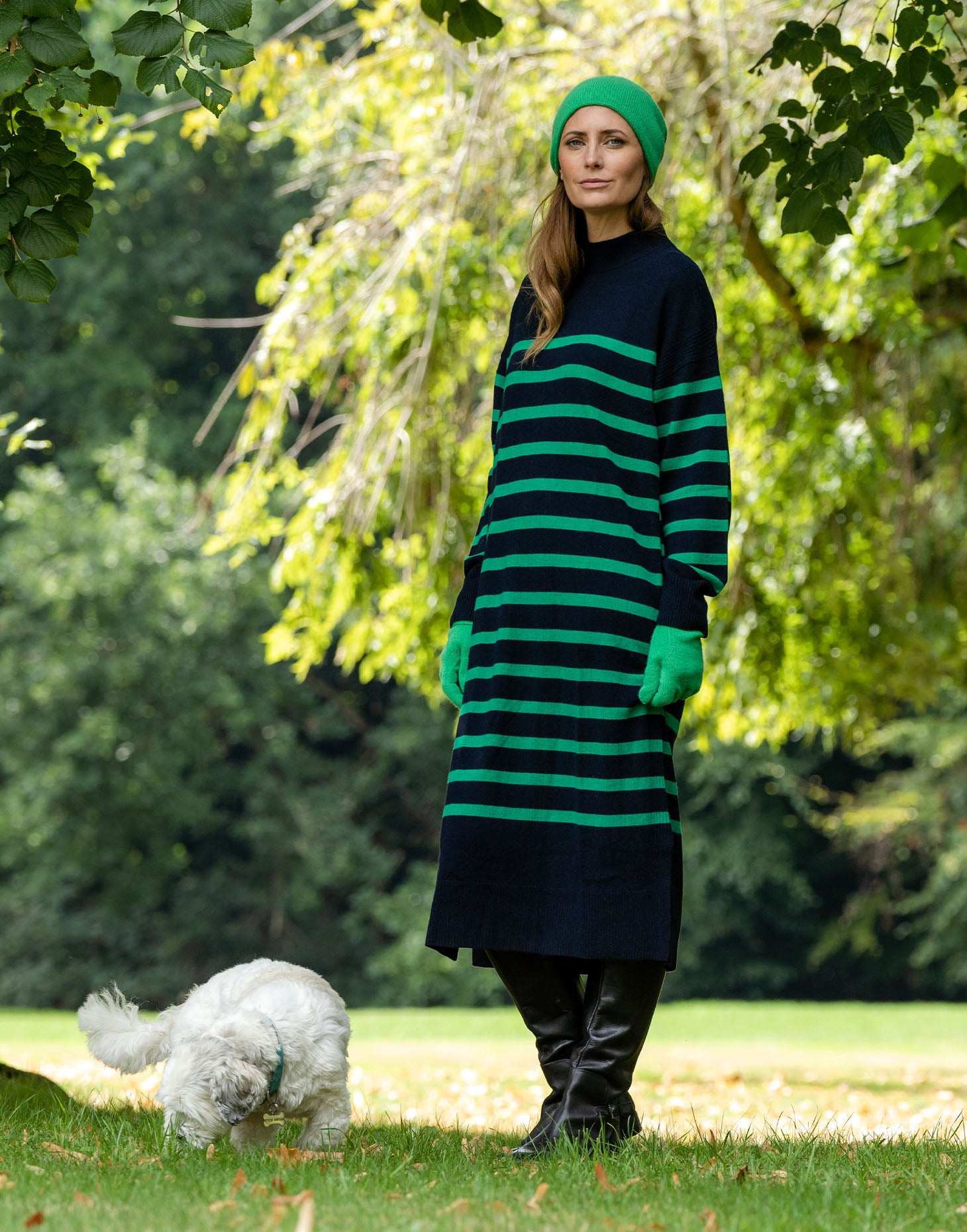 Knitted Navy cashmere mix dress with contrasting Green Bretton stripes, turtle neck and side seam detailing.