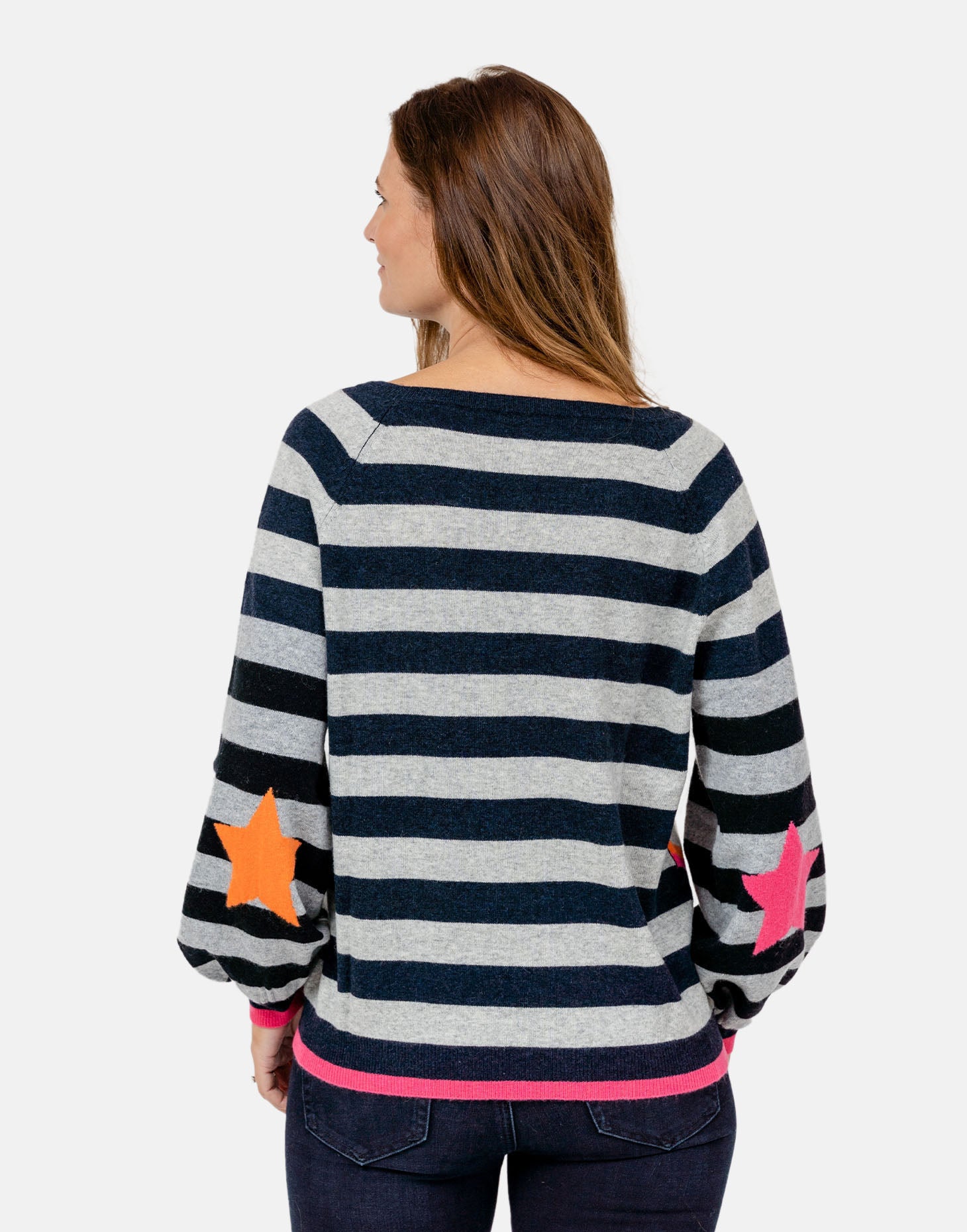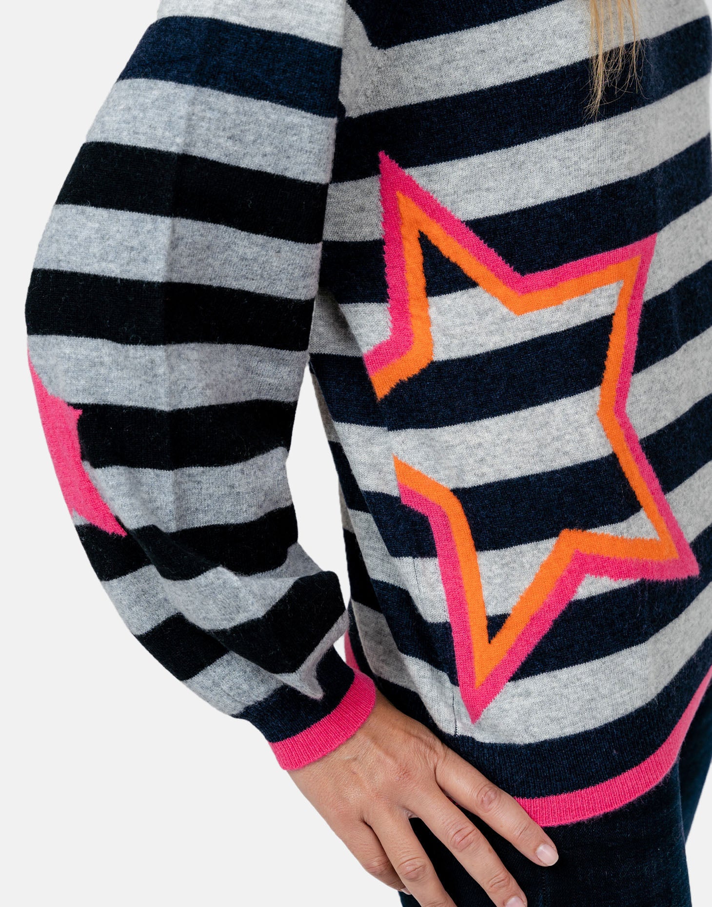 A raglan sleeve, relaxed fit, Grey based cashmere mix jumper with Navy, Pink and Orange star detailing.