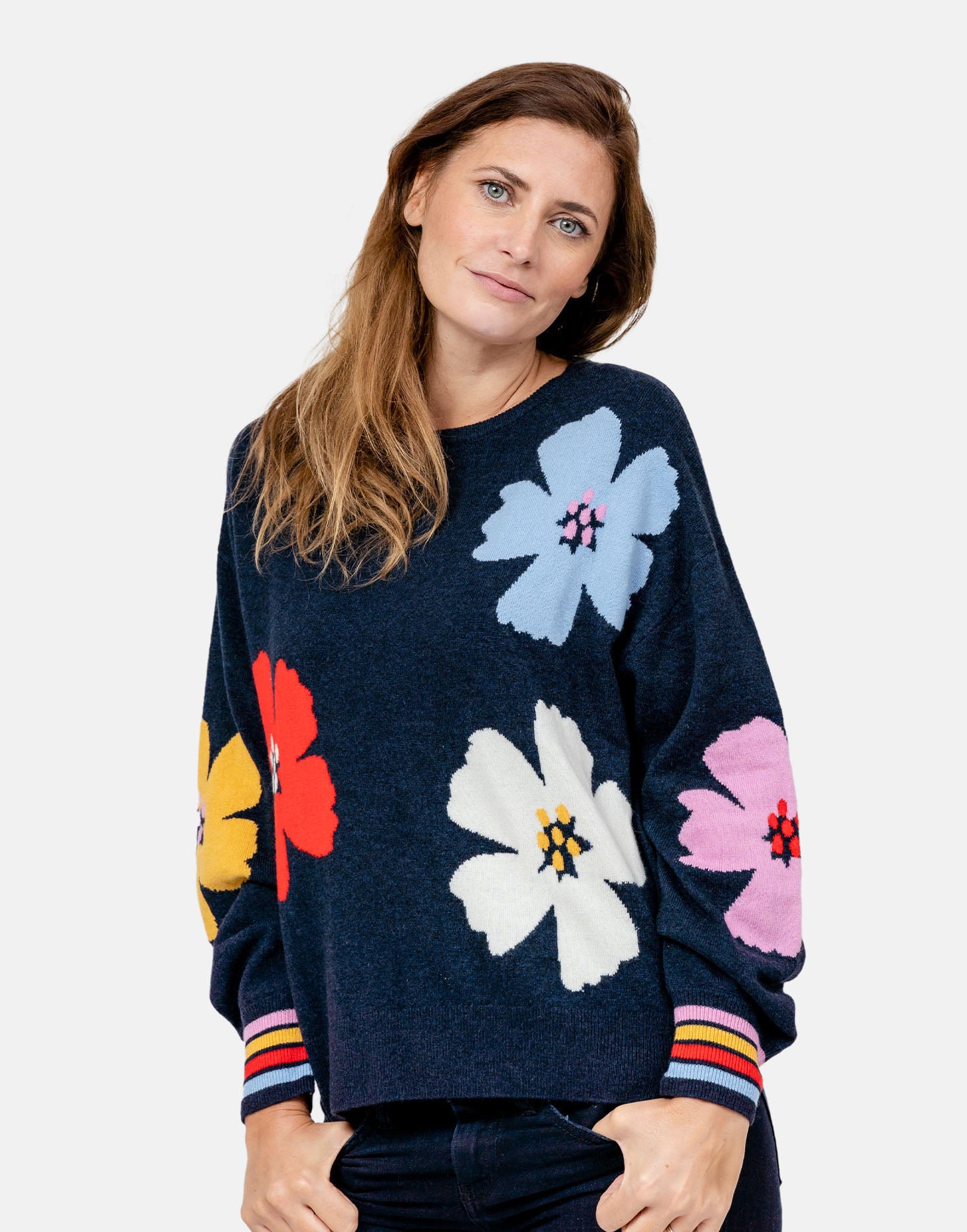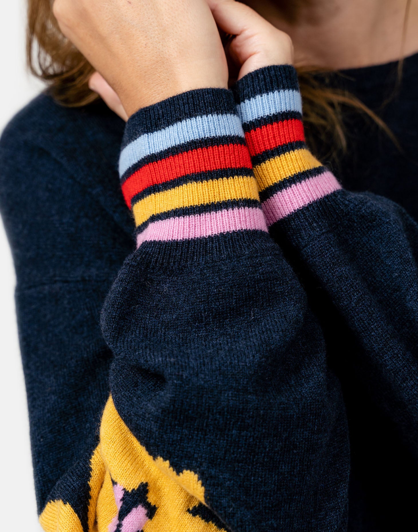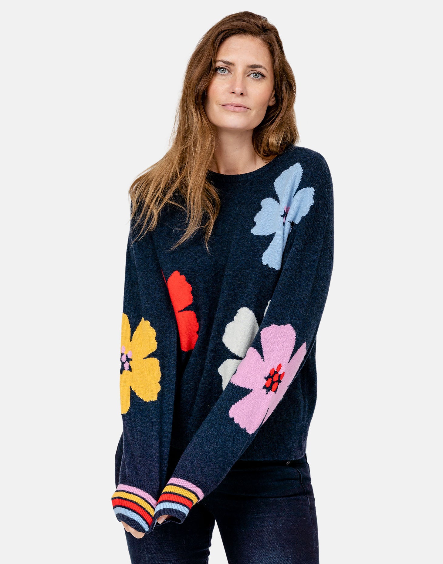 Knitted Navy based cashmere mix jumper with a bright, colourful floral design and cuff detailing.