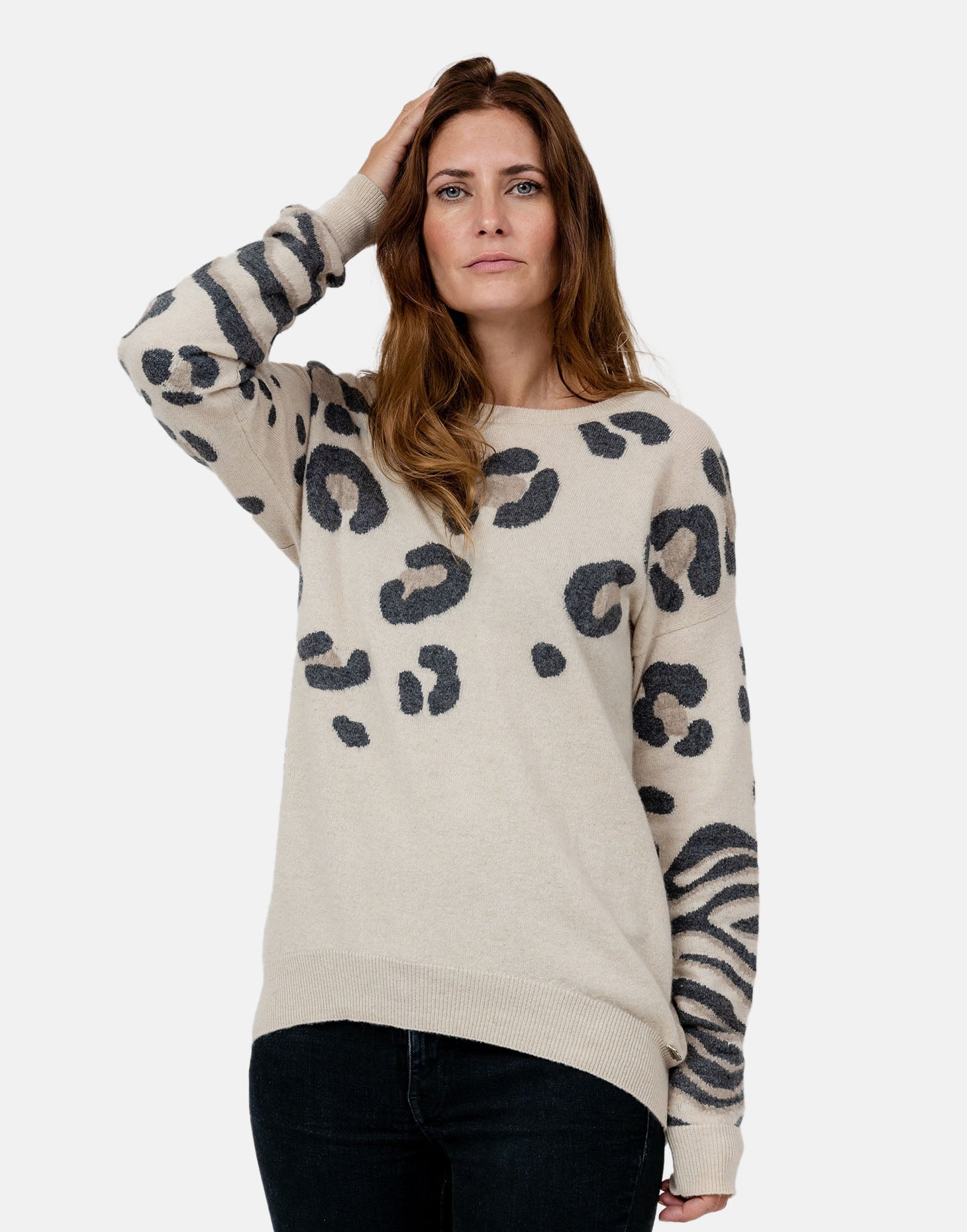 Feel wild this Winter in the all new Leona jumper! This style is available in Grey/Pink and Oatmeal/Grey.