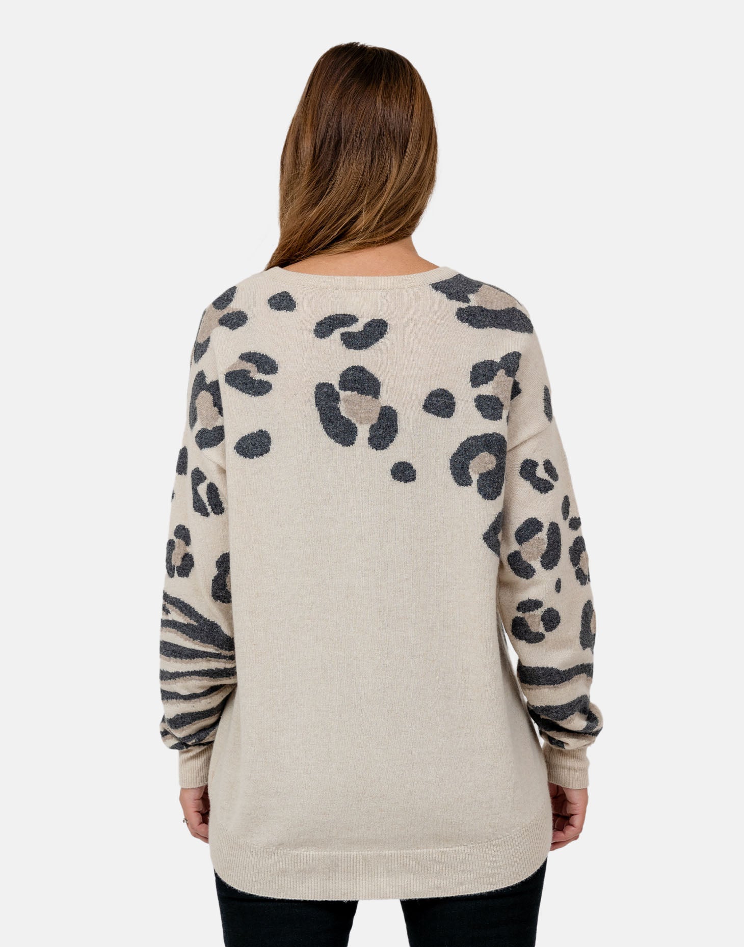 A crew neck, relaxed fit jumper with Leopard spot and Zebra stripe detailing. Made from 100% cashmere, the Leona is luxurious and ultra soft feel.