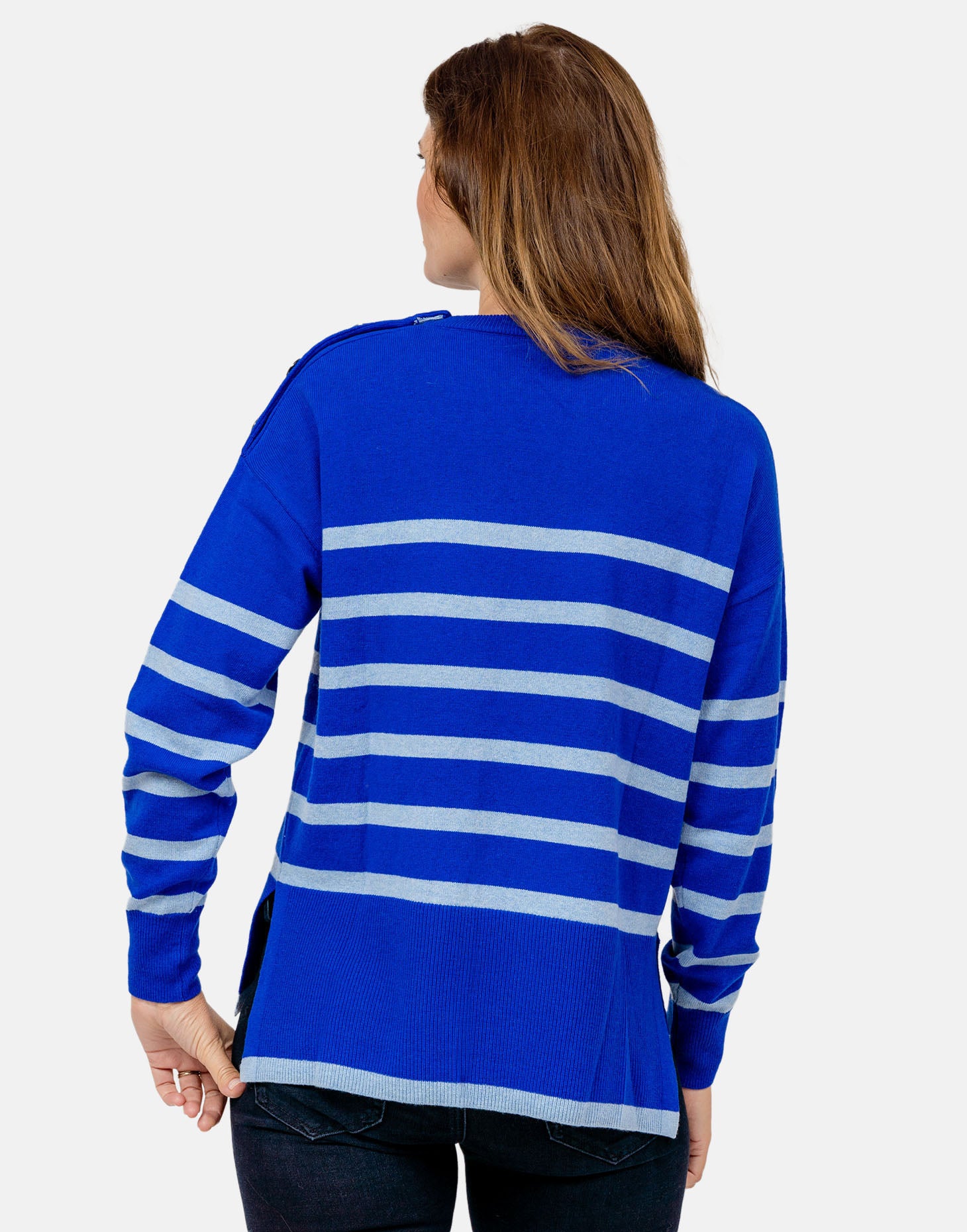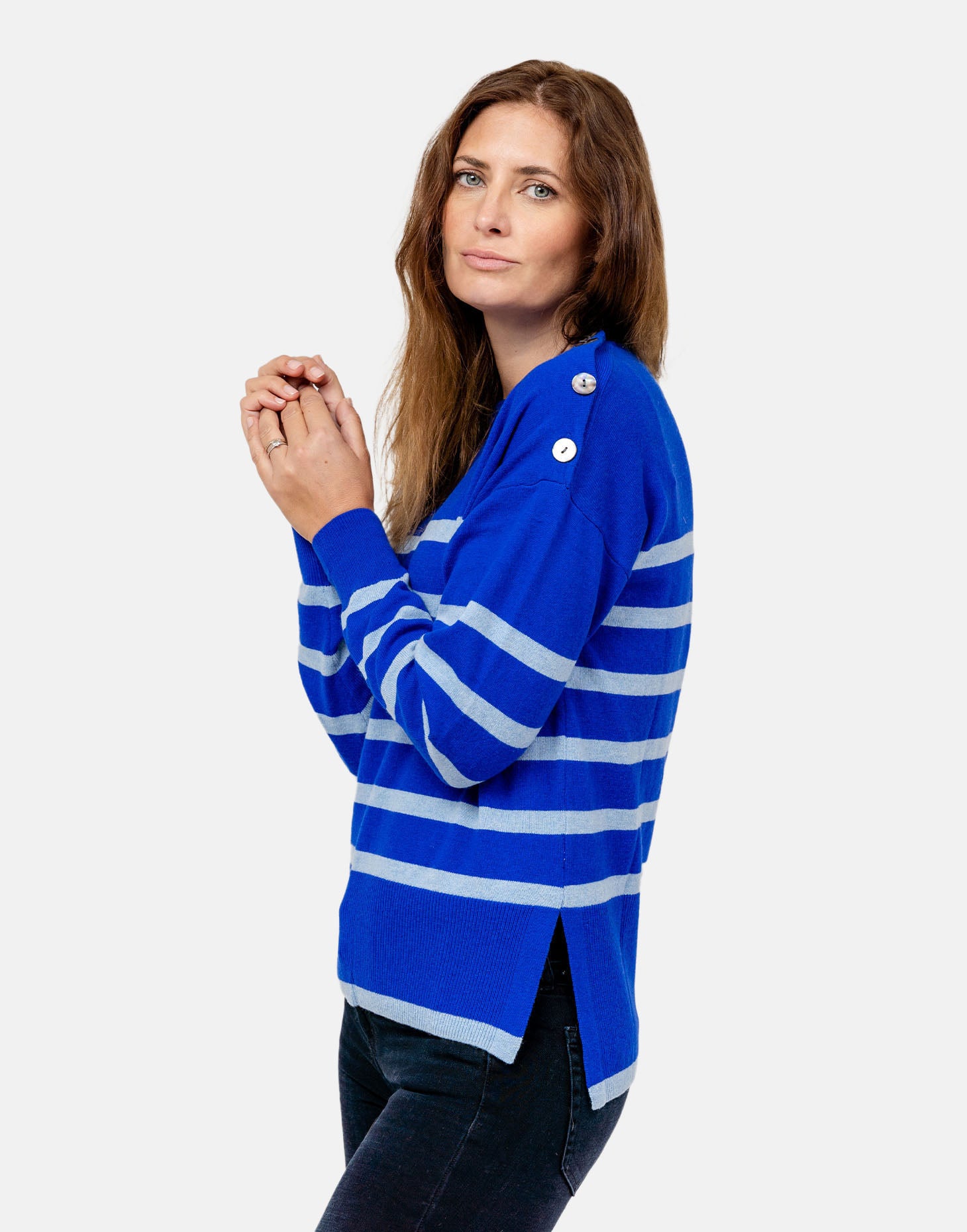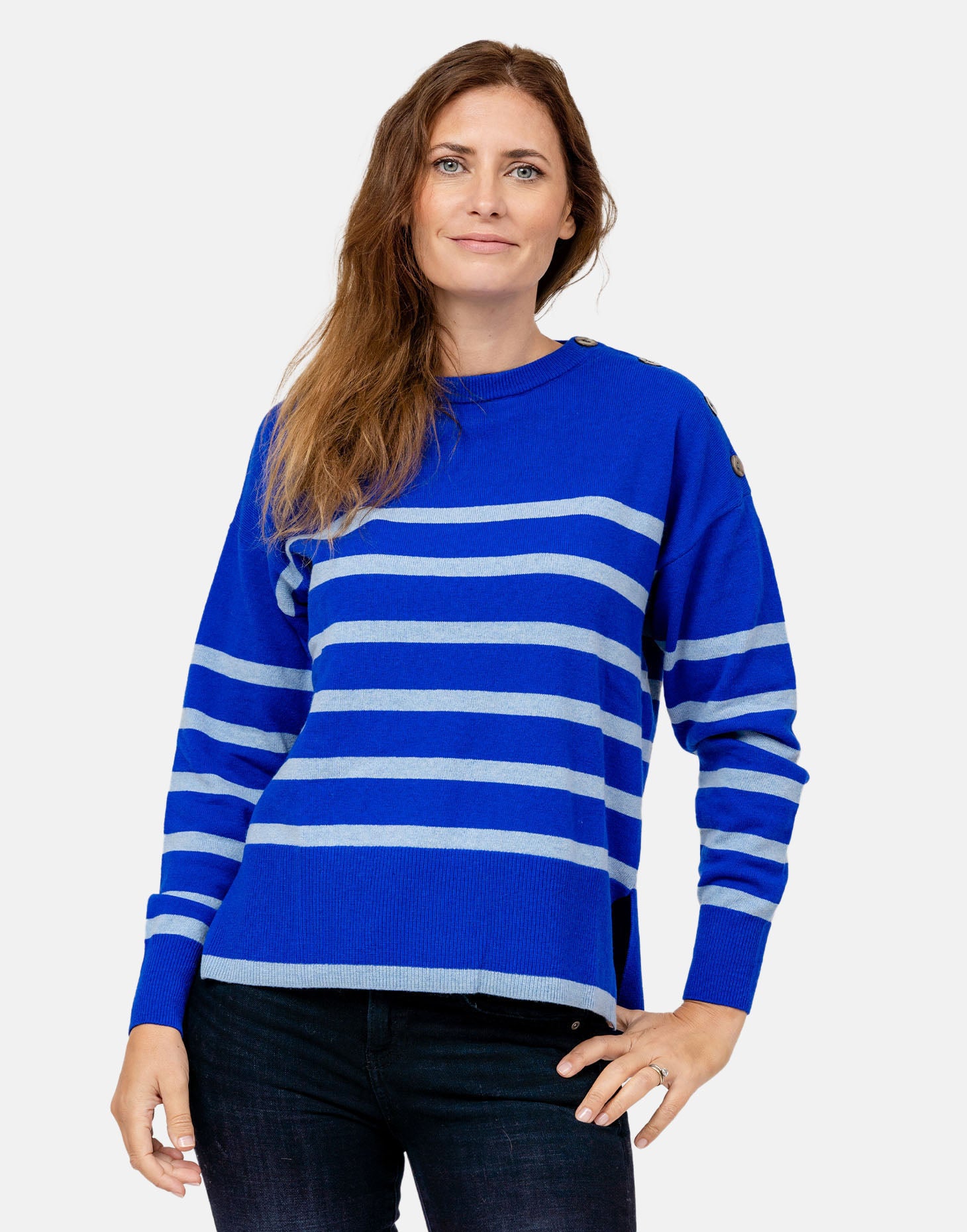 Crew neck Blue based, long sleeved jumper with contrasting Light Blue Bretton stripes and buttons. This style has a flattering shape and a split hem.