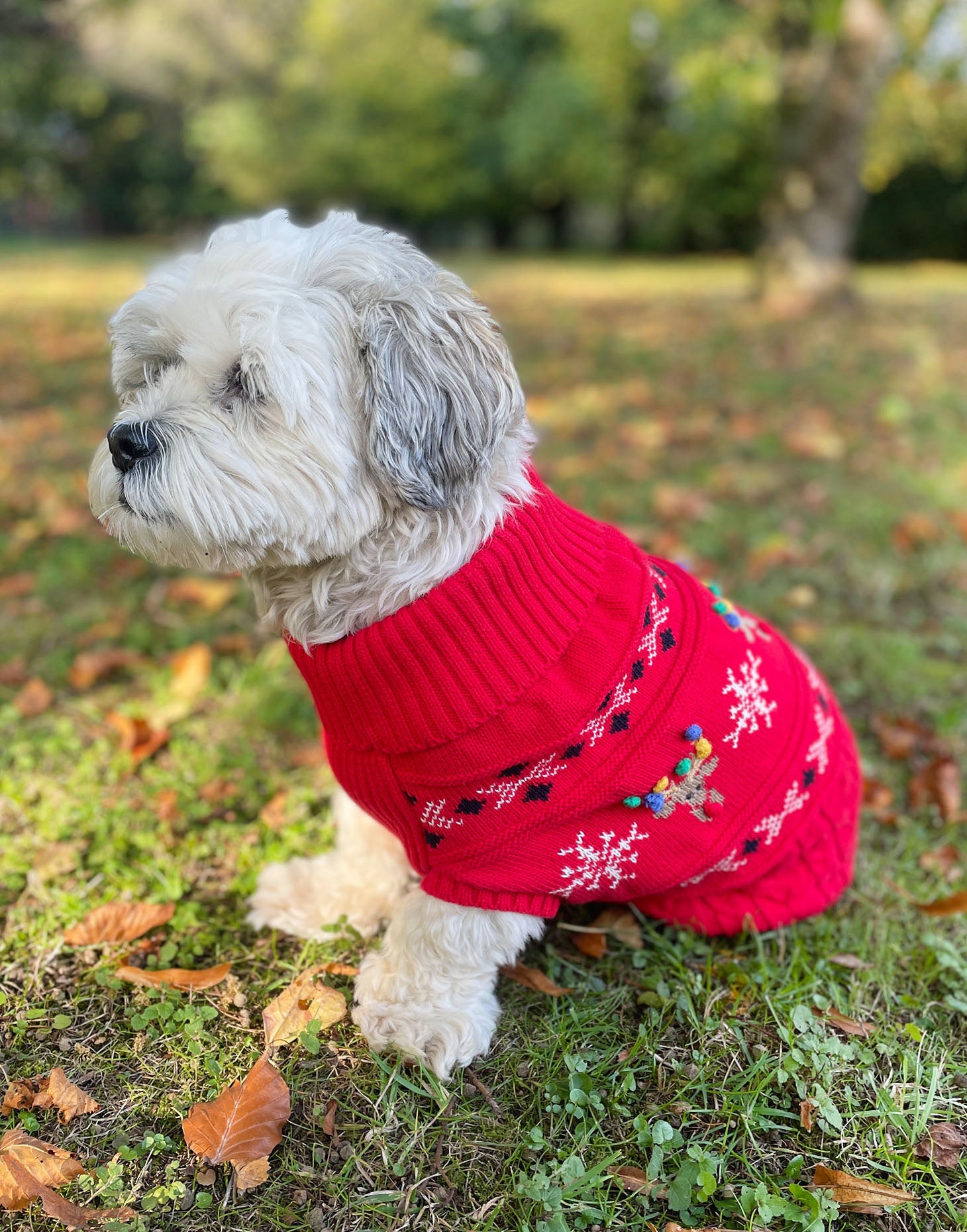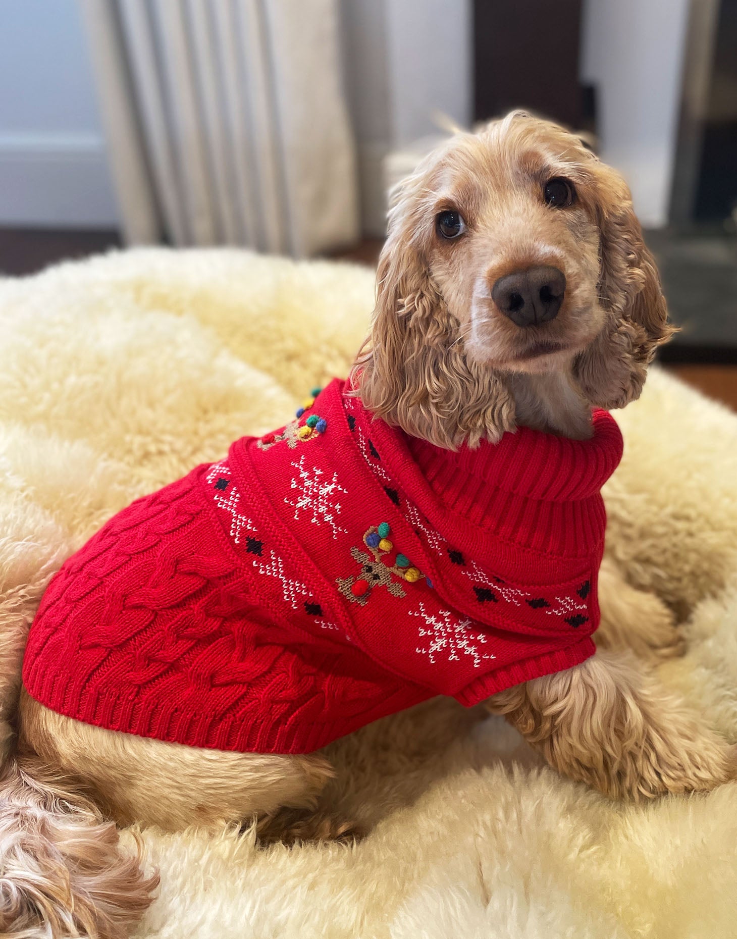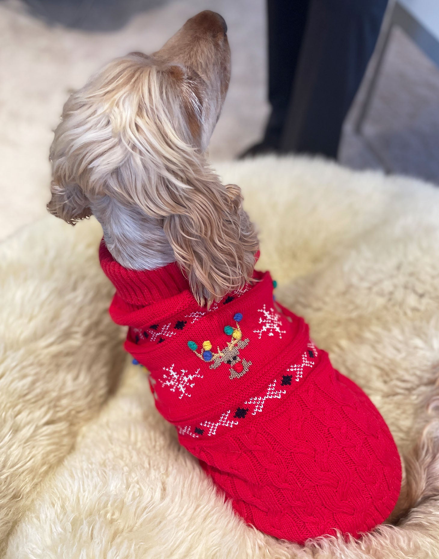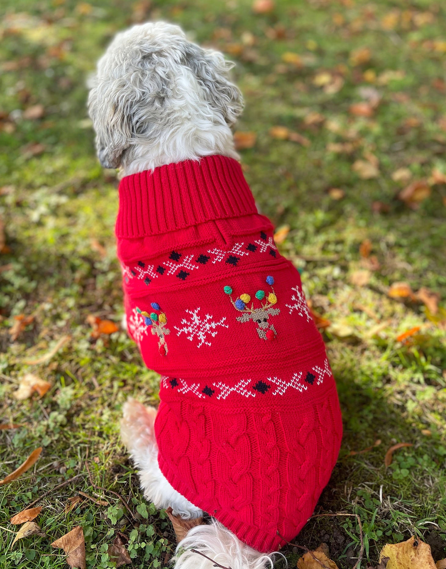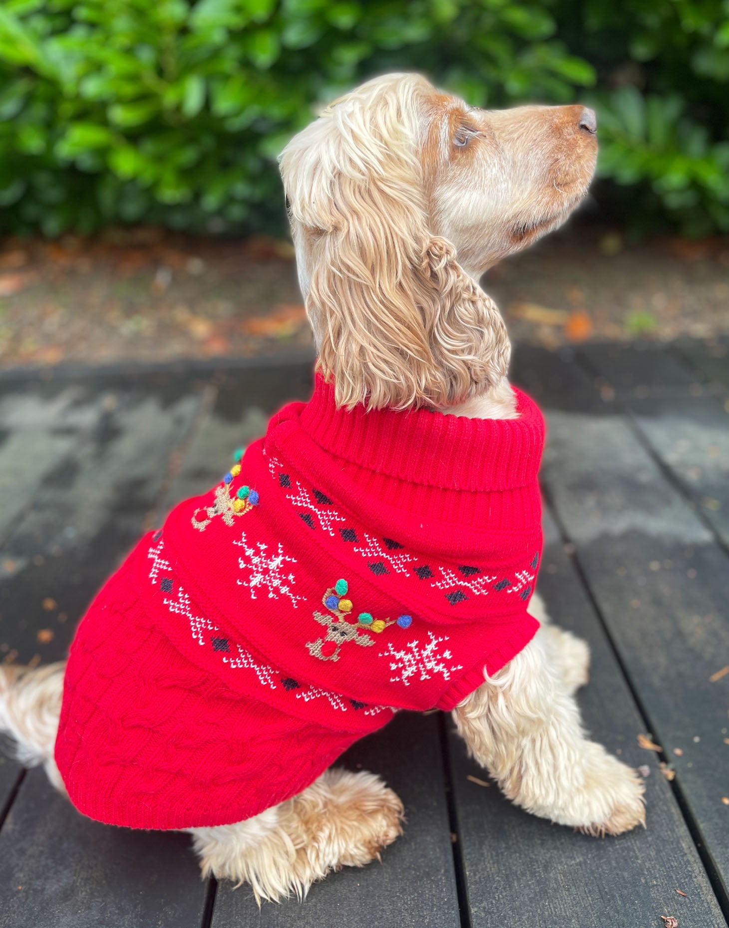 Knitted Red Reindeer Fairisle dog jumper made from 100% Cotton. This jumper is part of a Christmas Family set but can be purchased individually.