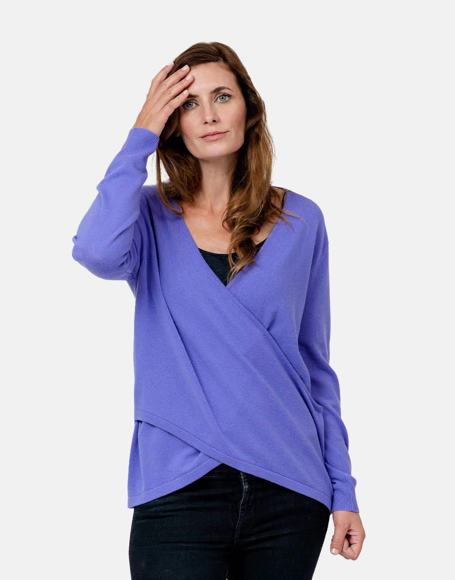 Flattering, Lilac wrap over, cashmere mix jumper with generous ruched detailing and curved hem.