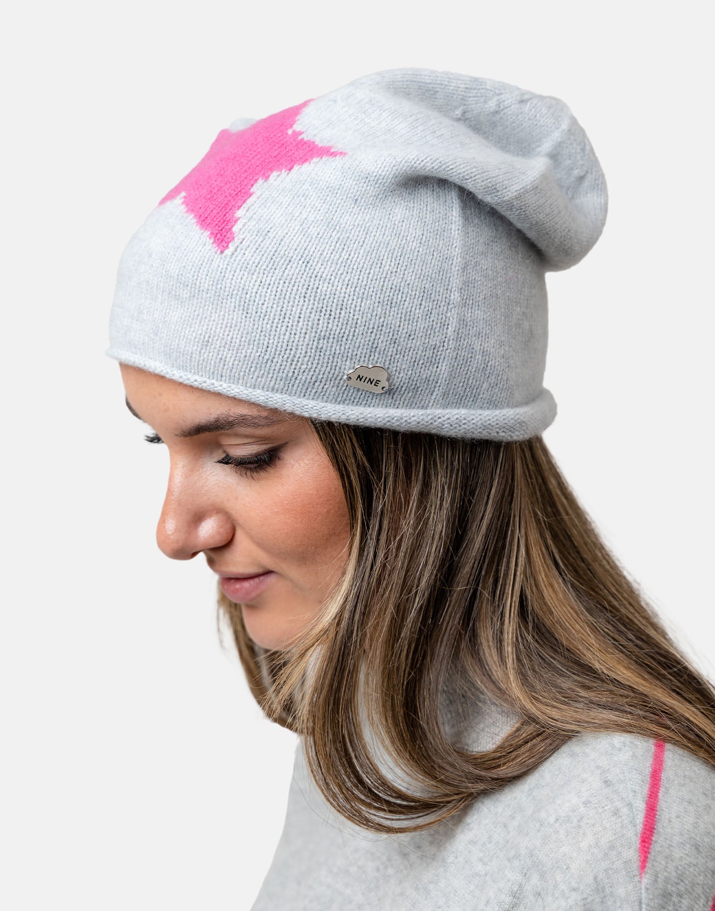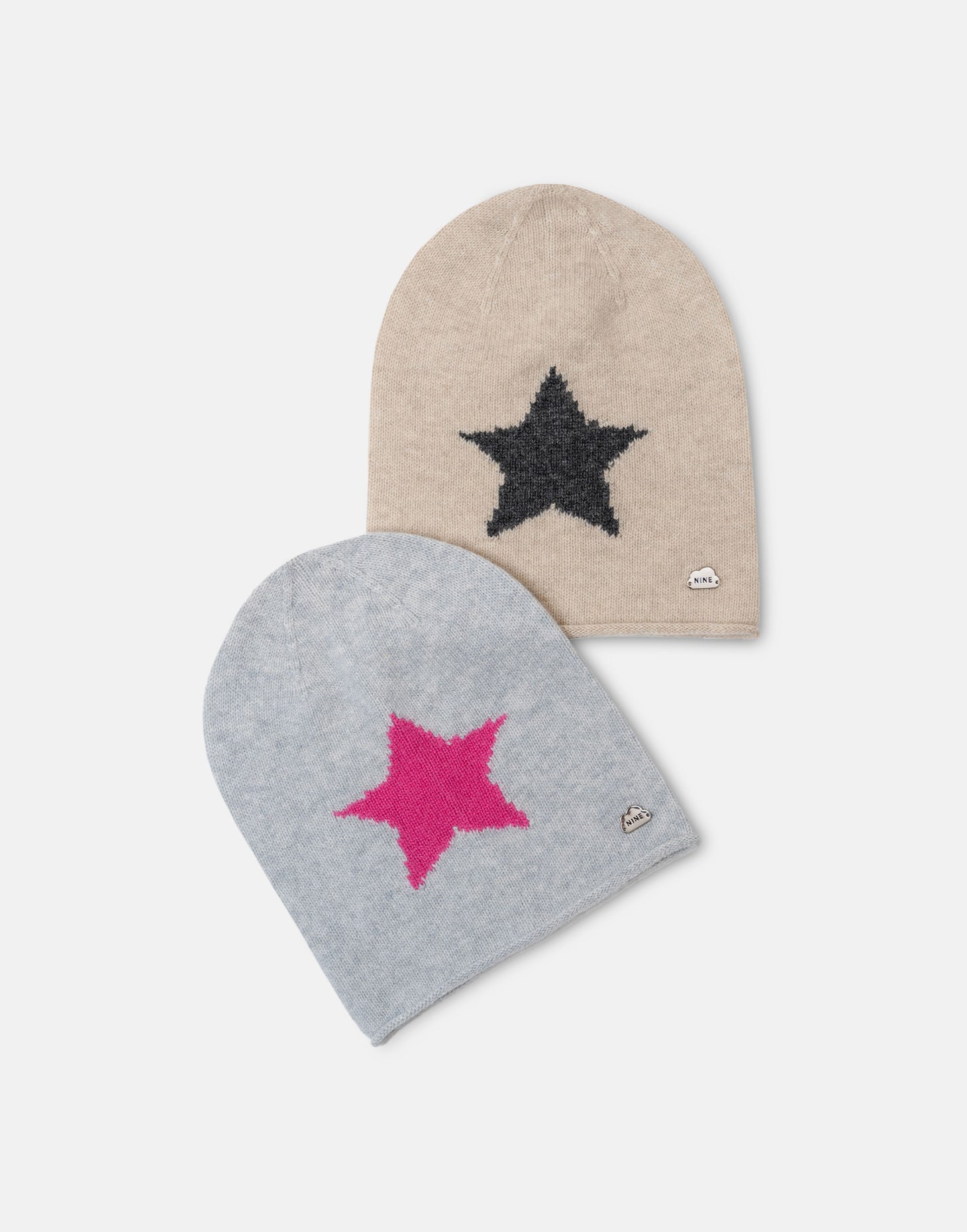Plain beanie with star motif on the front and Cloud Nine metal badge Made from 100% cashmere.