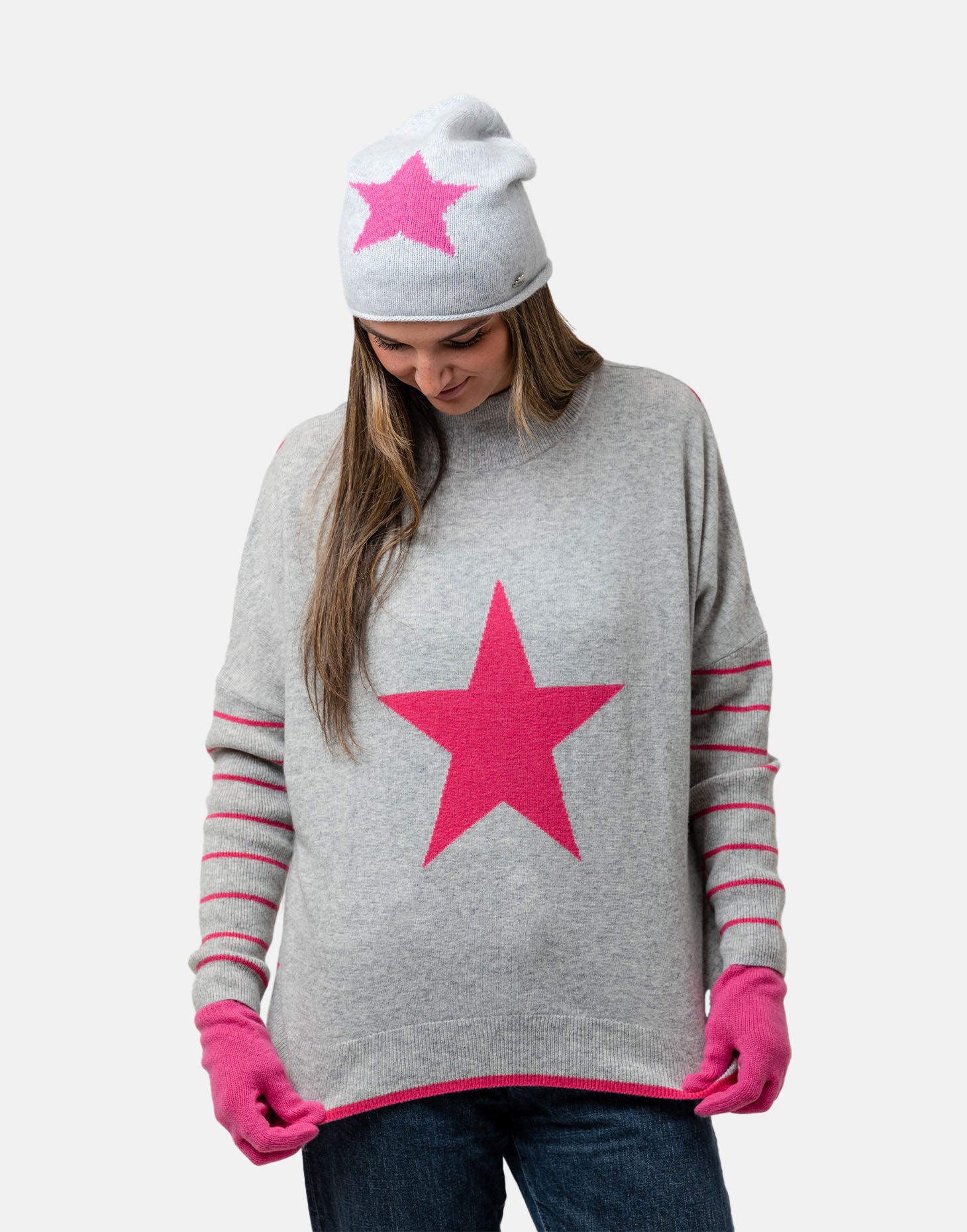 A relaxed fit, long sleeved turtle neck Grey jumper with star and stripe detailing made from a cashmere mix.